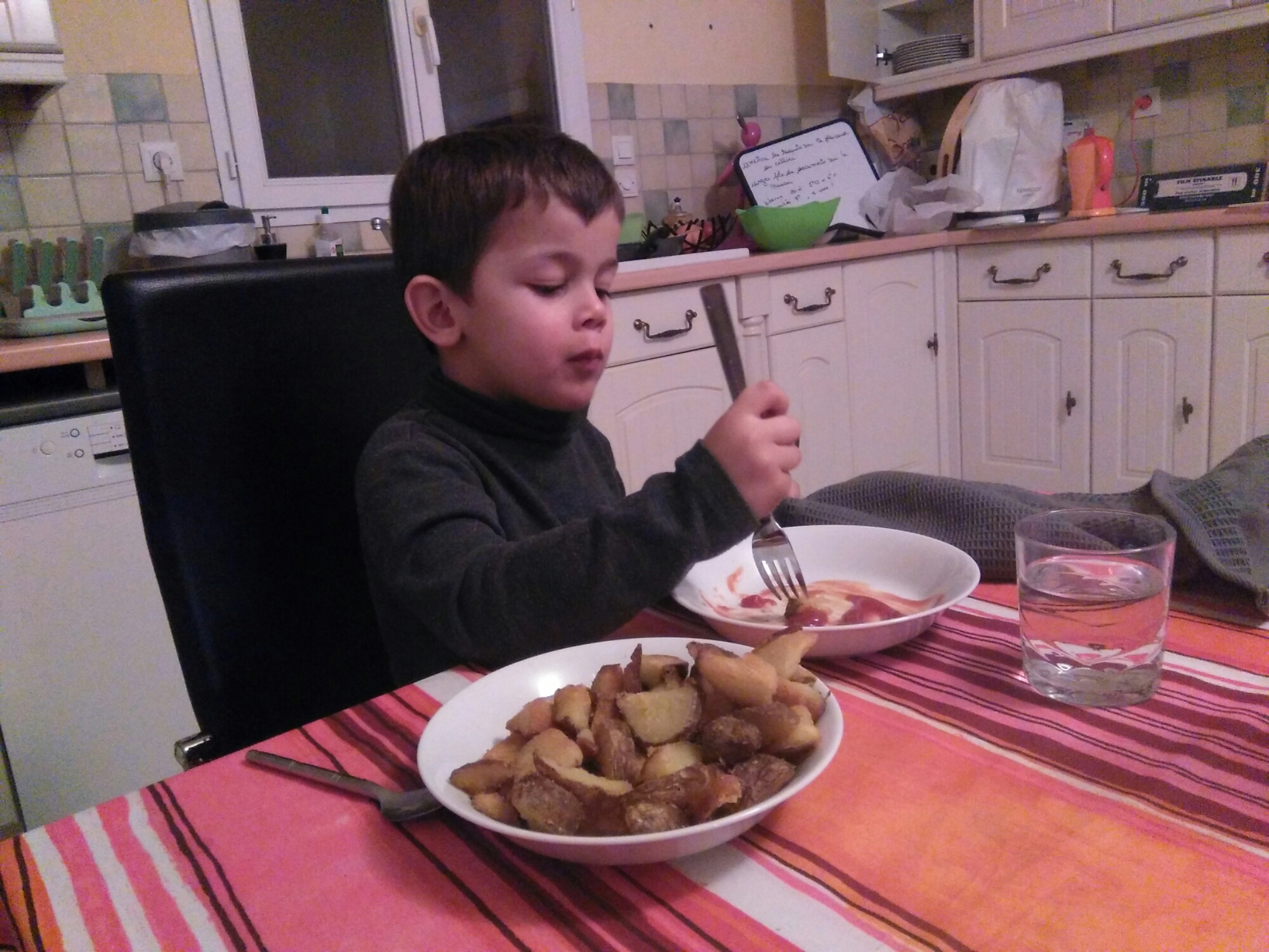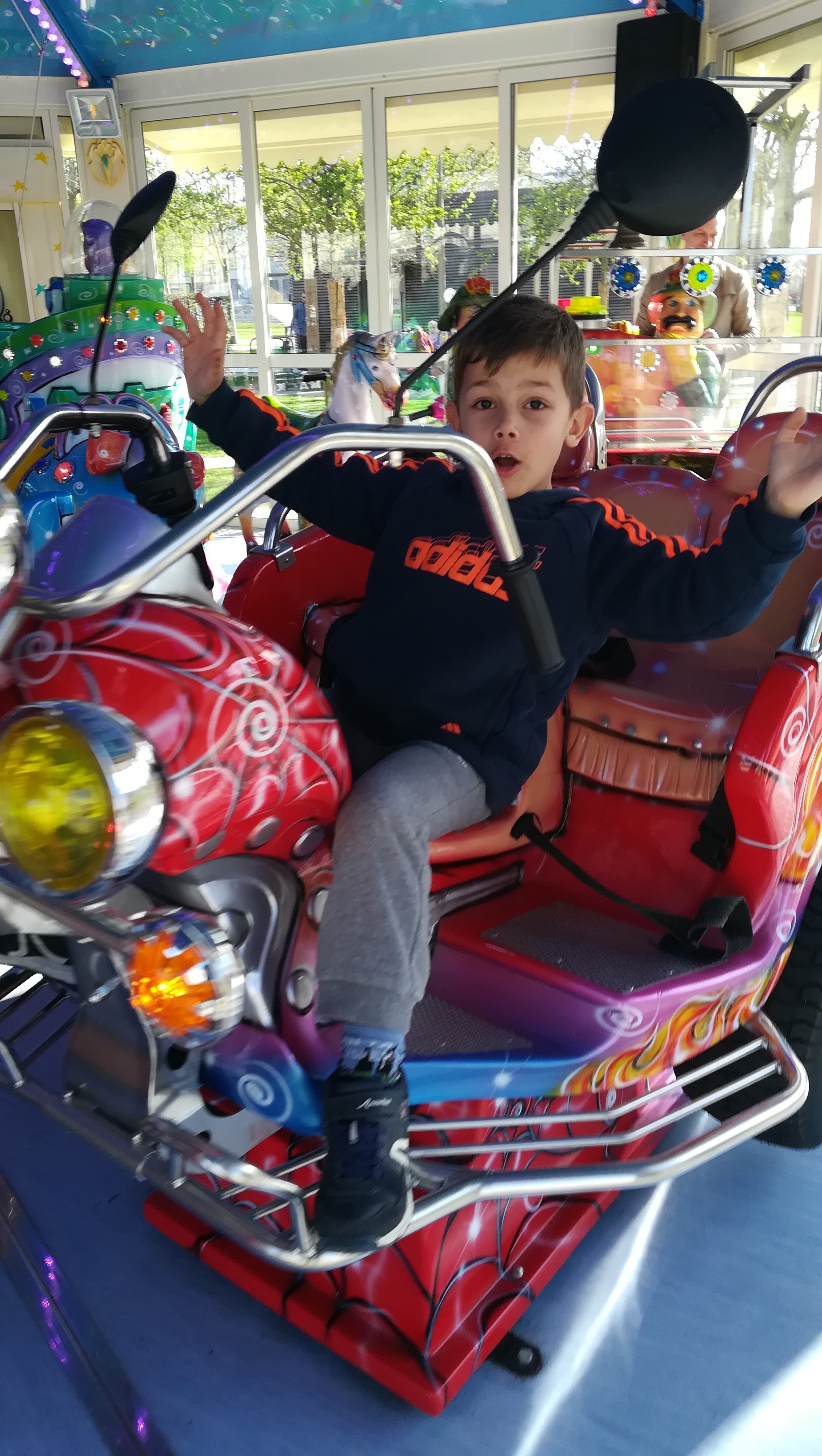Une chouette soirée : une sortie précoce de la garderie, une balade en centre-ville où l’on croise un manège tout en couleurs et enfin un « repas » au fast-food. La belle vie !