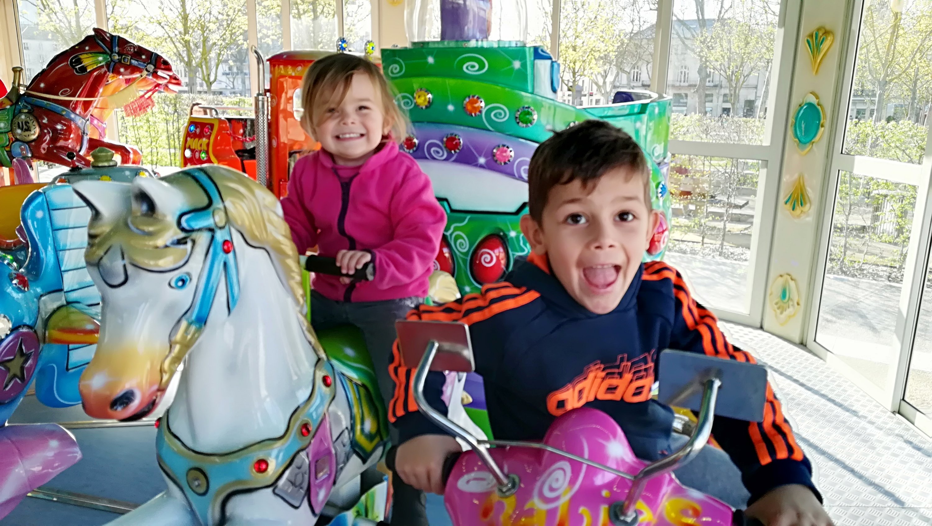 Une chouette soirée : une sortie précoce de la garderie, une balade en centre-ville où l’on croise un manège tout en couleurs et enfin un « repas » au fast-food. La belle vie !